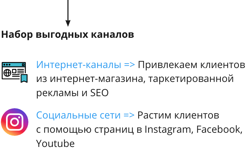 Для масштабирования бизнеса, как правило, необходим не один, а набор емких каналов, с которых мы сможем привлечь нужное количество клиентов.